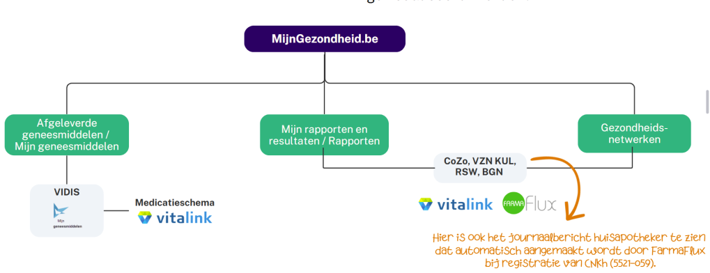 Hiervoor kunnen ze vertrekken vanuit MijnGezondheid. Op VIDIS, waar de patiënt ook zijn afleverhistoriek kan zien, wordt momenteel enkel het vitalink medicatieschema getoont en via CoZo, VZN KUL, RSW en BGN kan zowel het Vitalink medicatieschema als het FMS gevisualiseerd worden.